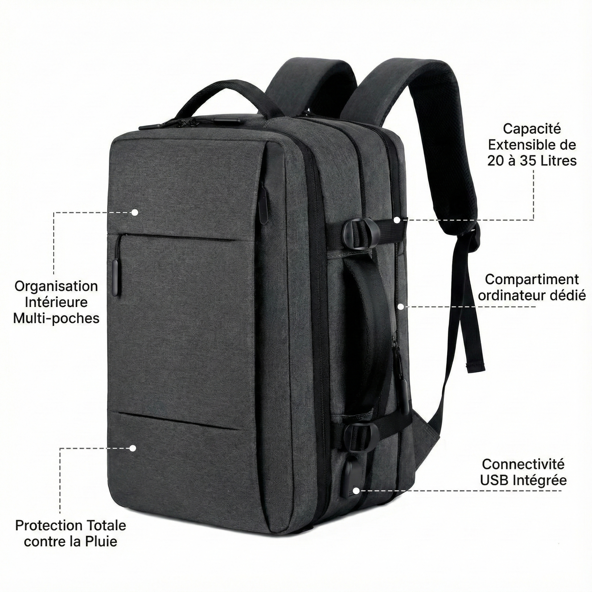 - Capacité Extensible de 20 à 35 Litres : Offre un volume de stockage modulable pour organiser méthodiquement l'intégralité de votre équipement professionnel et vos effets personnels.