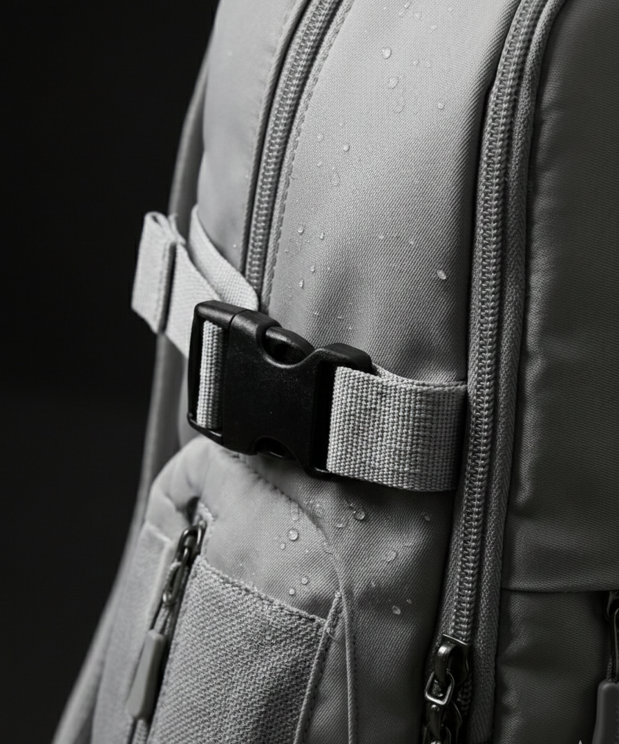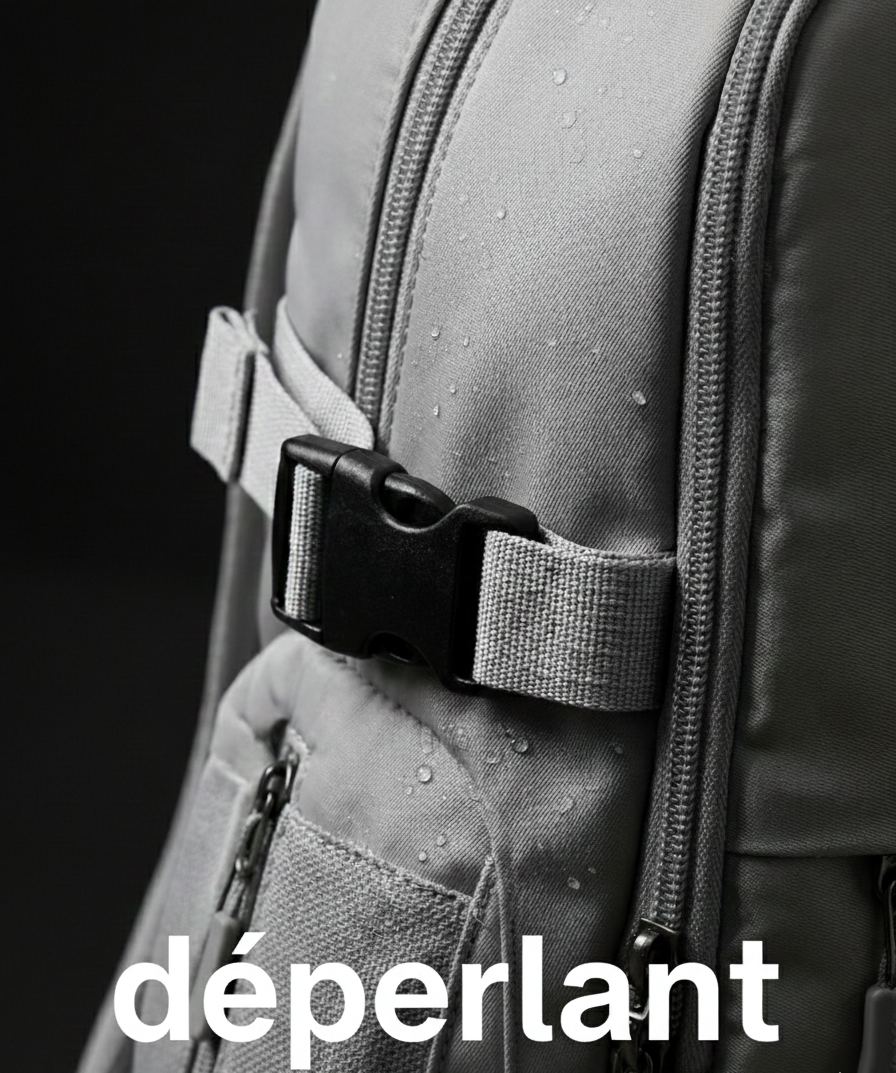 Tissu technique déperlant testé pour résister à une forte pluie. L’eau perle à la surface, sans jamais atteindre l’intérieur. C’est discret, mais redoutablement efficace.