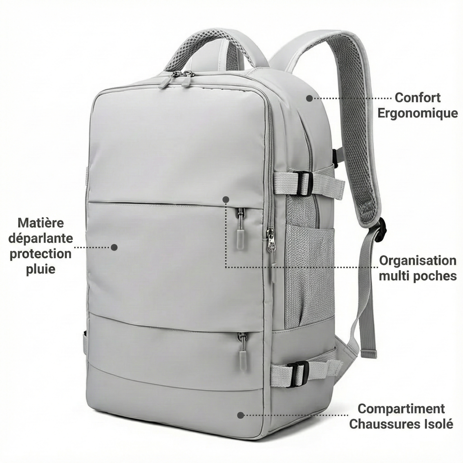 - Compartiment Chaussures Isolé : Une gestion intelligente pour garder vos vêtements propres à l'abri des salissures.