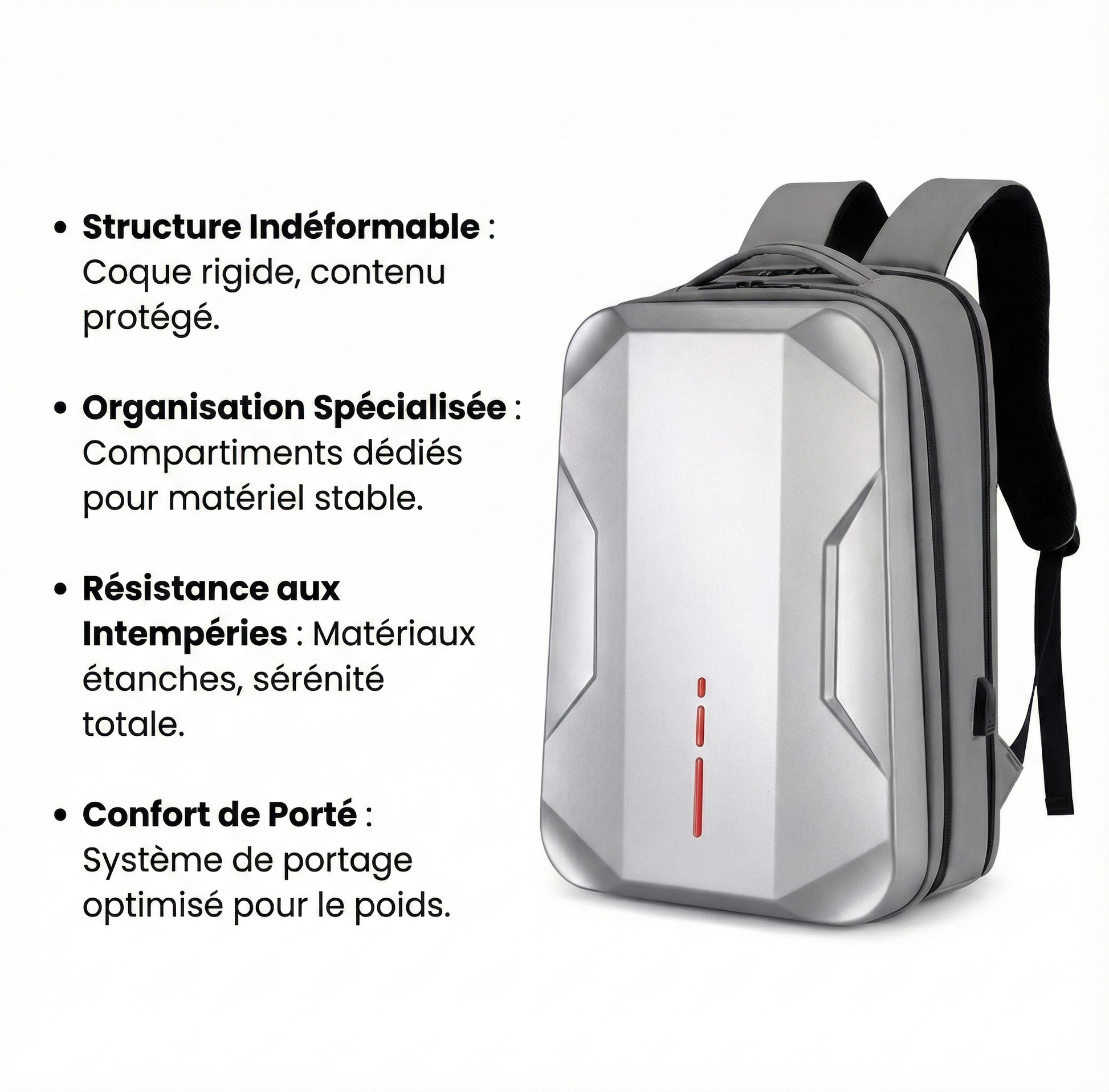 - Amateur de Design Futuriste : Vous appréciez les lignes épurées et la finition "coque dure" qui se démarque des sacs à dos traditionnels.
