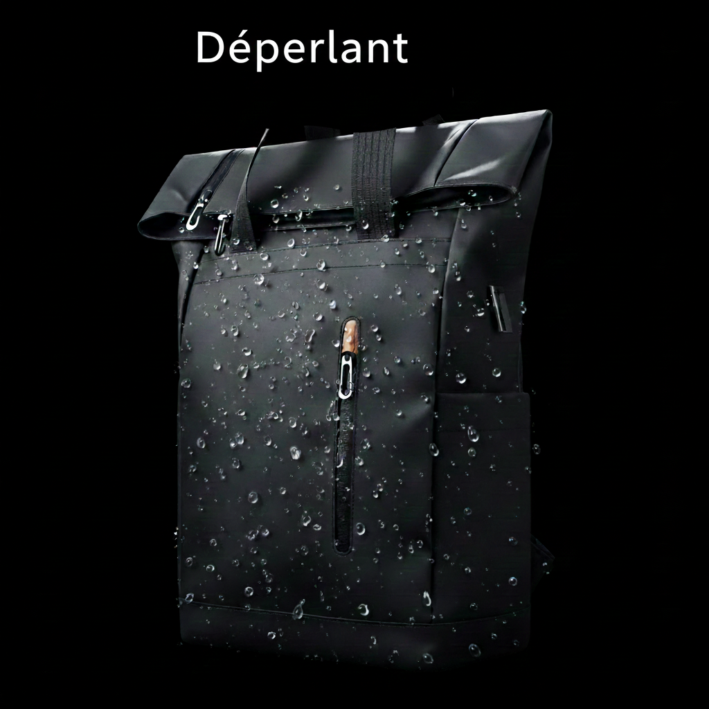 Tissu technique déperlant testé pour résister à une forte pluie. L’eau perle à la surface, sans jamais atteindre l’intérieur. C’est discret, mais redoutablement efficace.