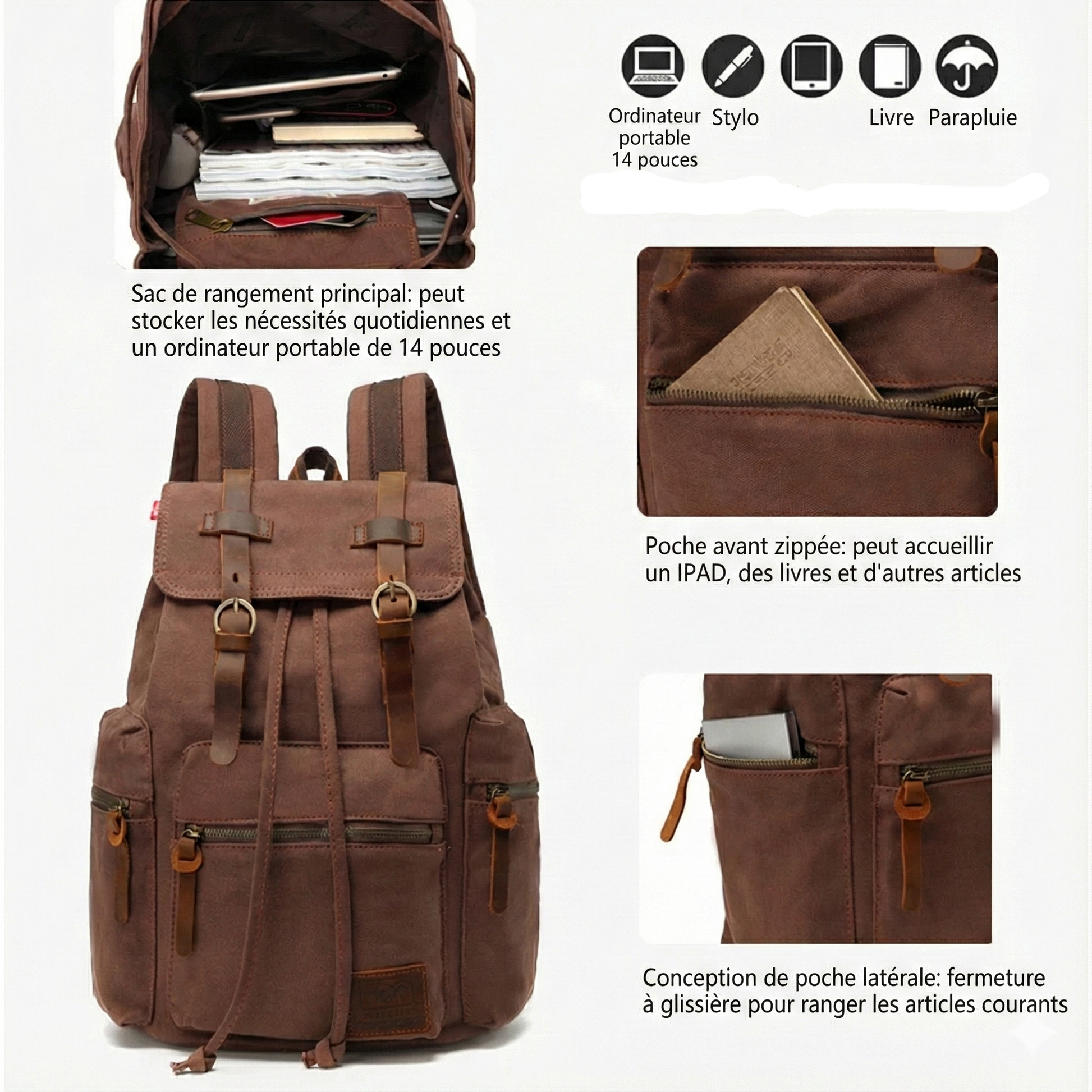 - Compartiment Ordinateur Dédié : Spécialement adapté pour accueillir et protéger un ordinateur portable de 14 pouces.