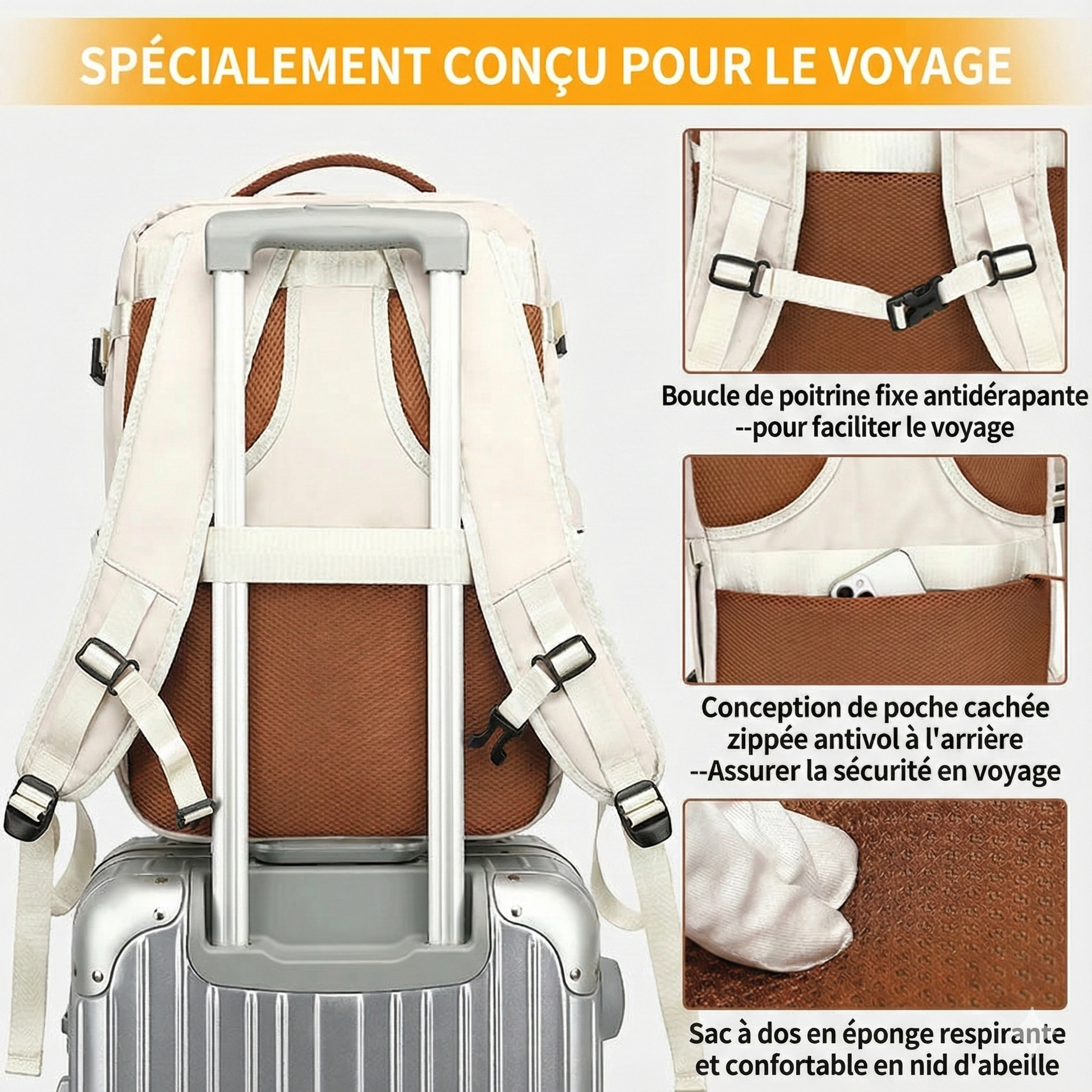 Dimensions : 40 cm x 30 cm x 20 cm → format cabine avion optimisé.