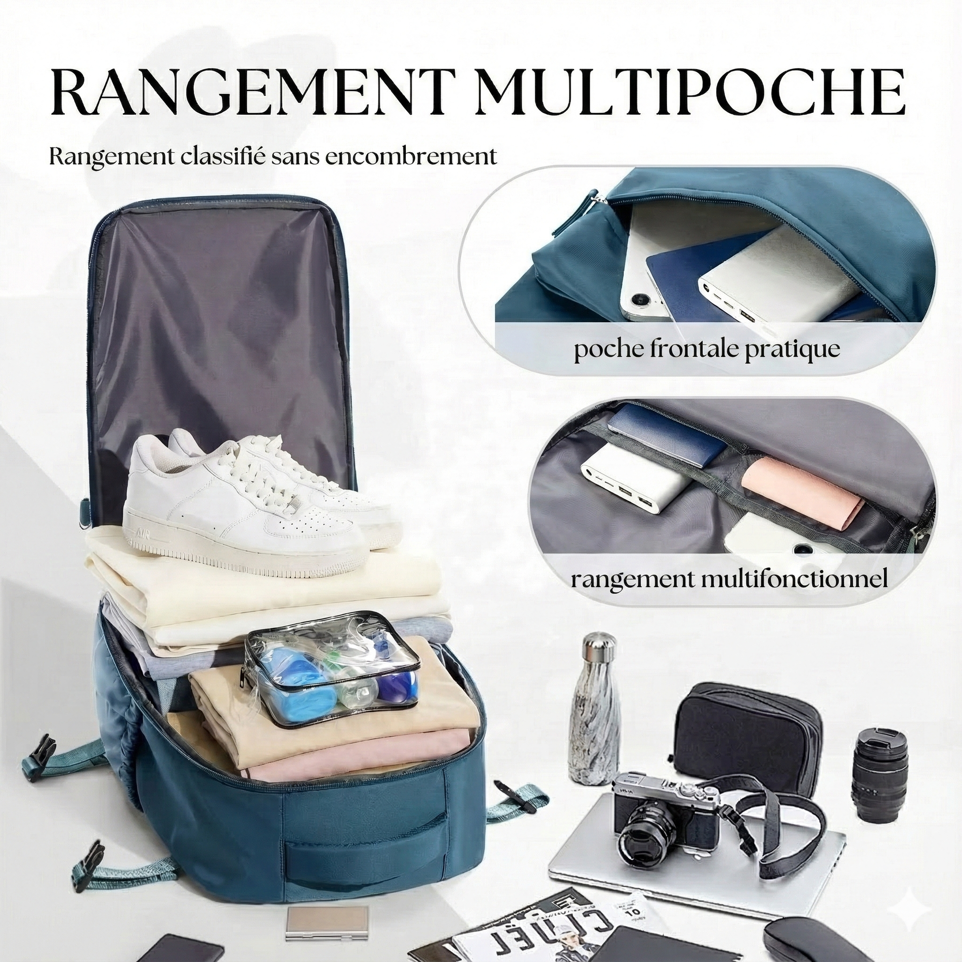 - Capacité Étonnante : Malgré son format compact, il offre un volume de 20 à 35 litres, équivalent à une petite valise de 20 pouces.