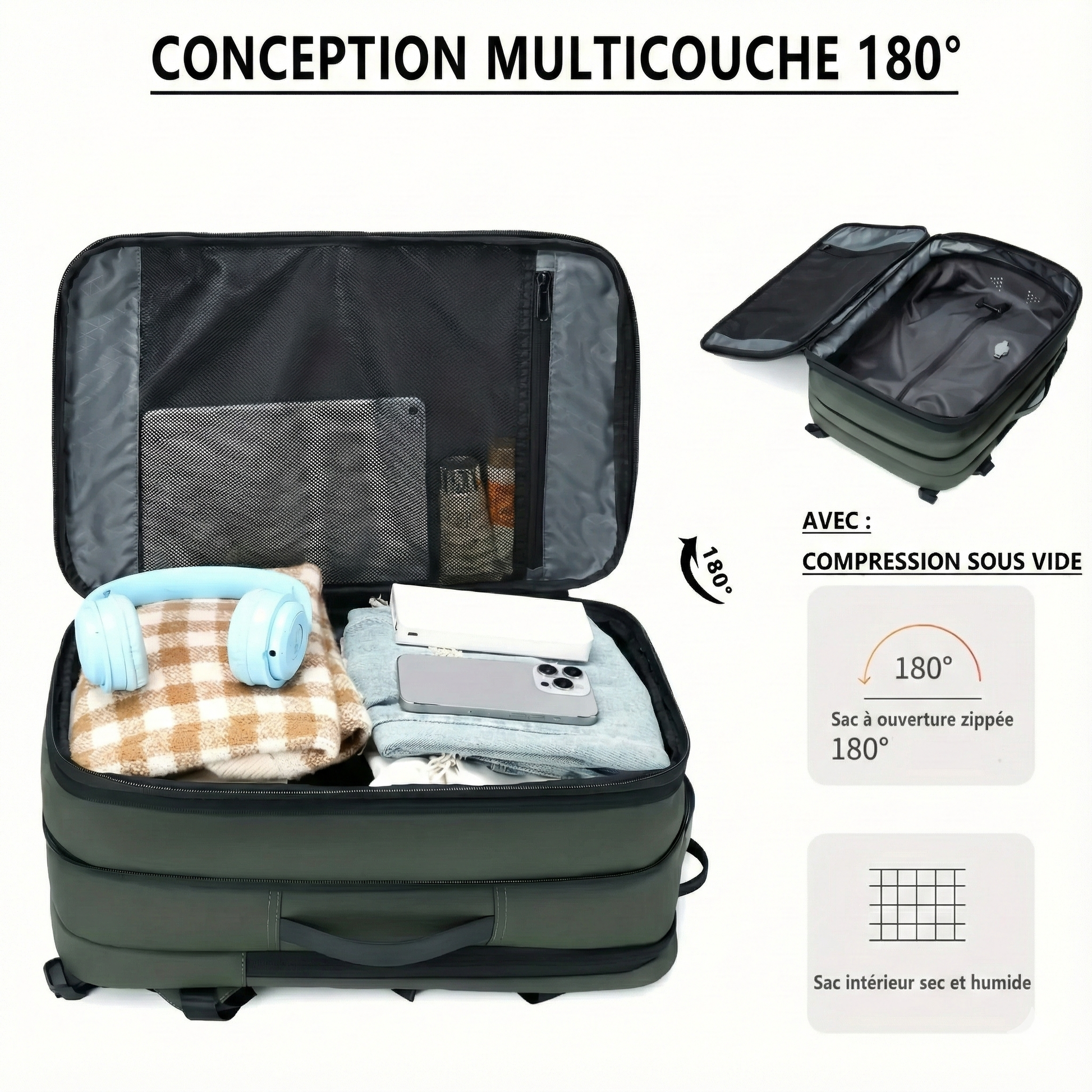 - Technologie de Compression sous Vide : Permet de réduire drastiquement le volume de vos vêtements pour un gain de place exceptionnel lors de vos déplacements.