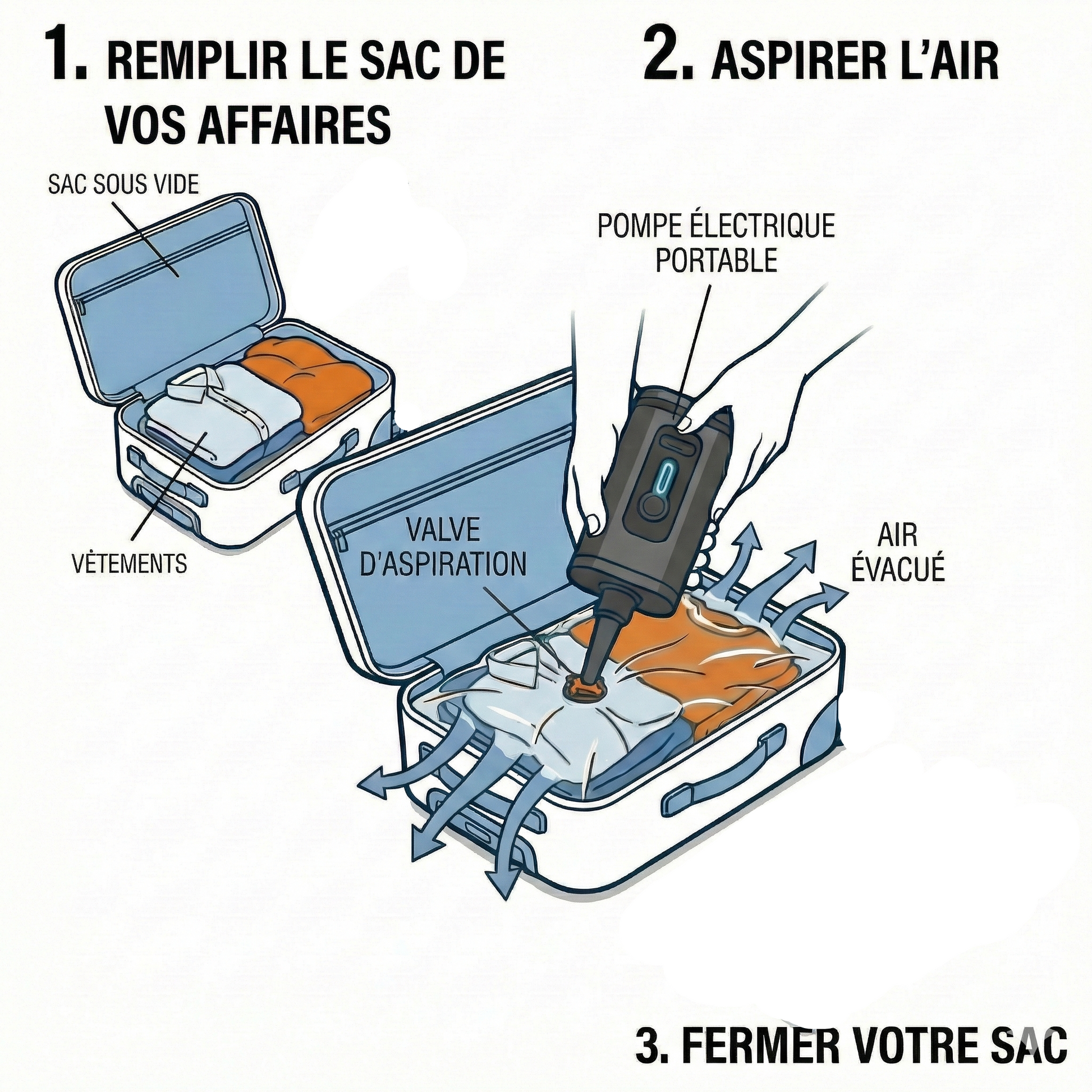 - Technologie de Compression sous Vide : Permet de réduire drastiquement le volume de vos vêtements pour un gain de place exceptionnel lors de vos déplacements.