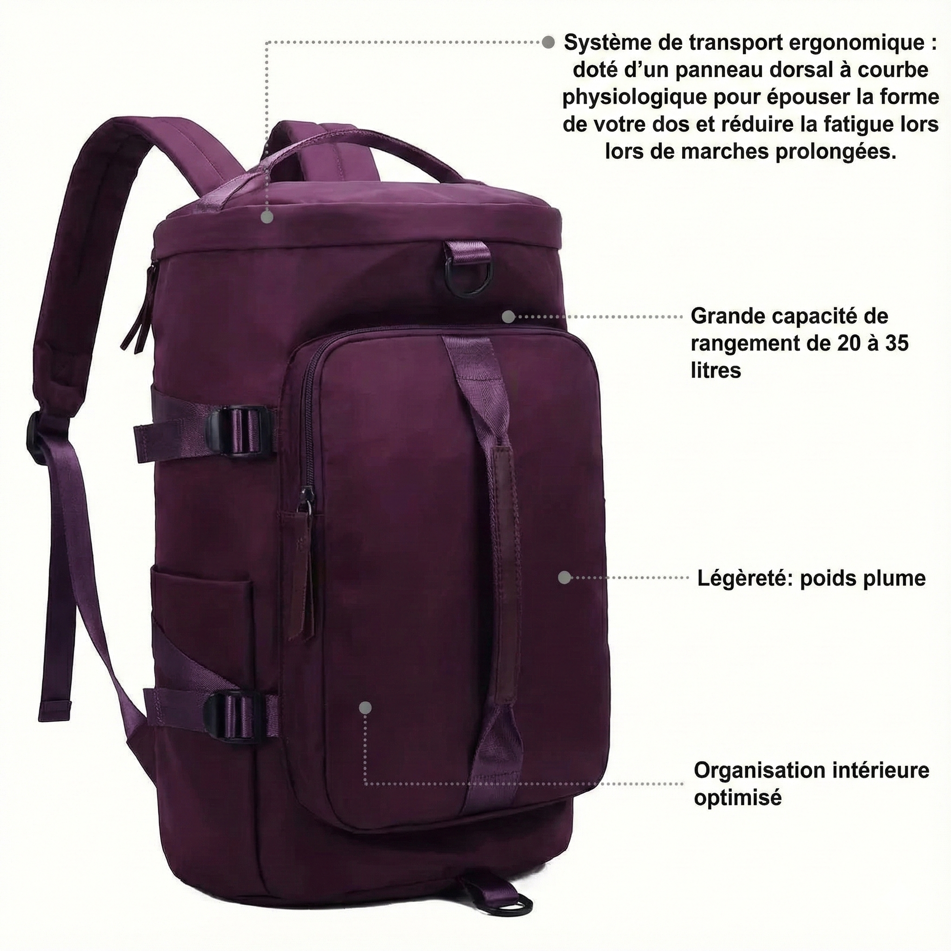 - Grande Capacité de Rangement : Offre un volume généreux de 20 à 35 litres, idéal pour organiser vos vêtements, équipements et accessoires de voyage.