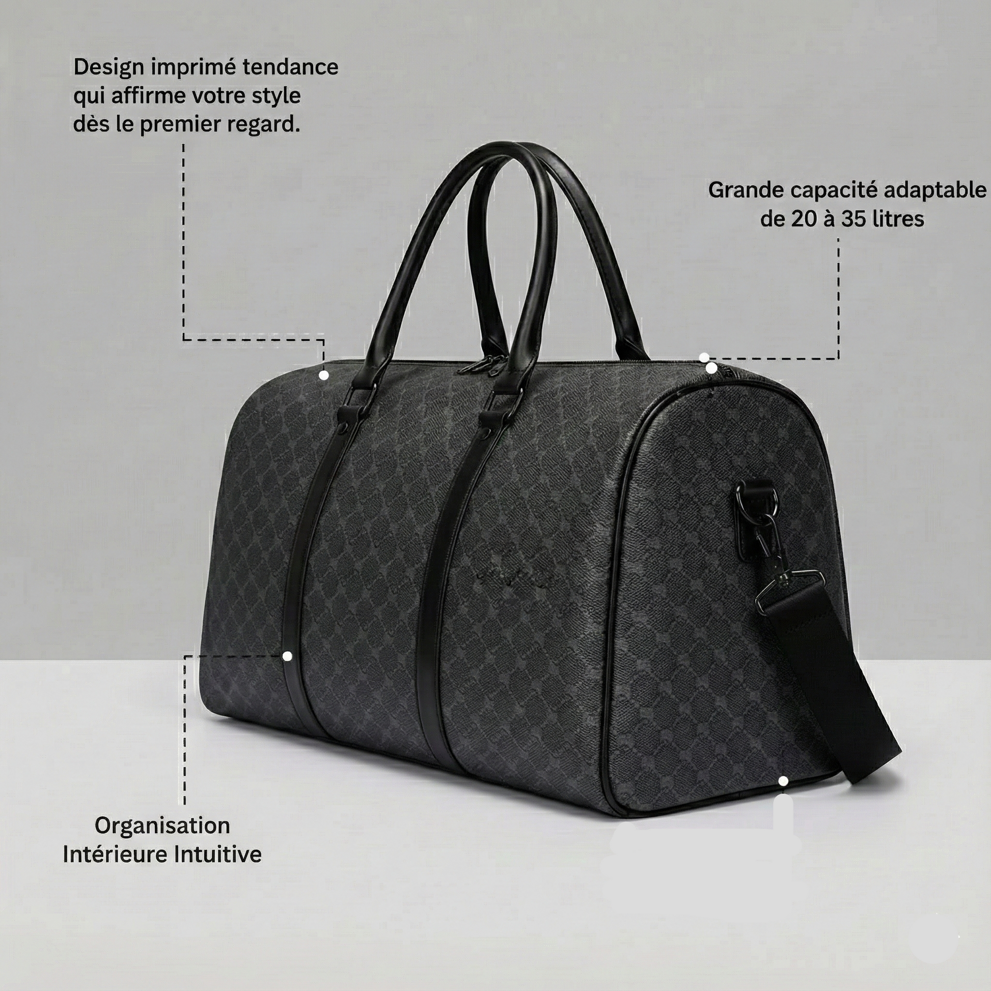 Redéfinissez votre allure lors de vos déplacements avec un accessoire qui incarne la sophistication moderne. Ce sac de voyage noir pour hommes se distingue par son imprimé complet classique, offrant une esthétique de luxe idéale pour le monde des affaires ou vos escapades personnelles. Alliant une grande capacité de stockage à une structure robuste, il est conçu pour transporter vos essentiels avec une distinction absolue, que vous vous rendiez à une réunion importante ou à une séance de fitness.