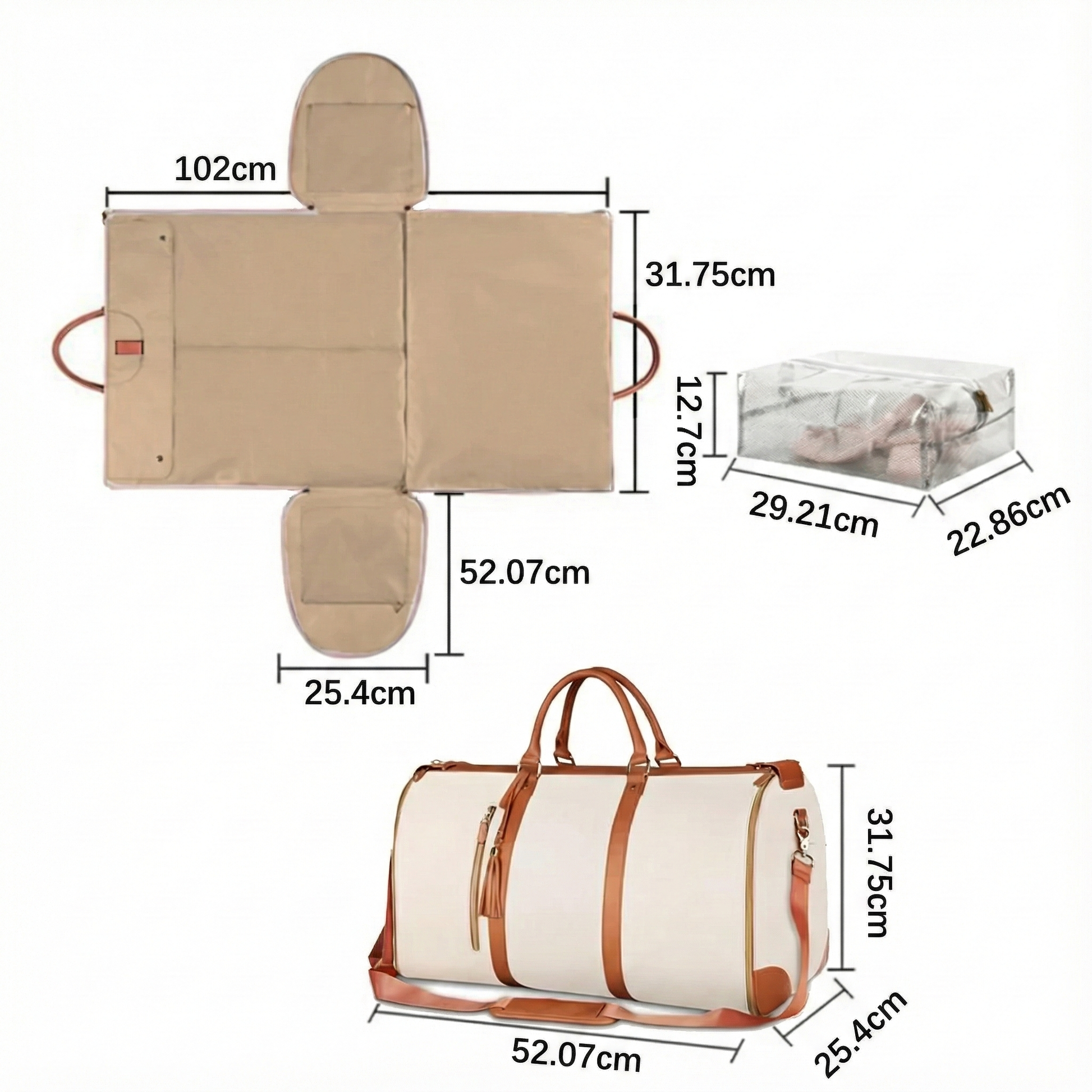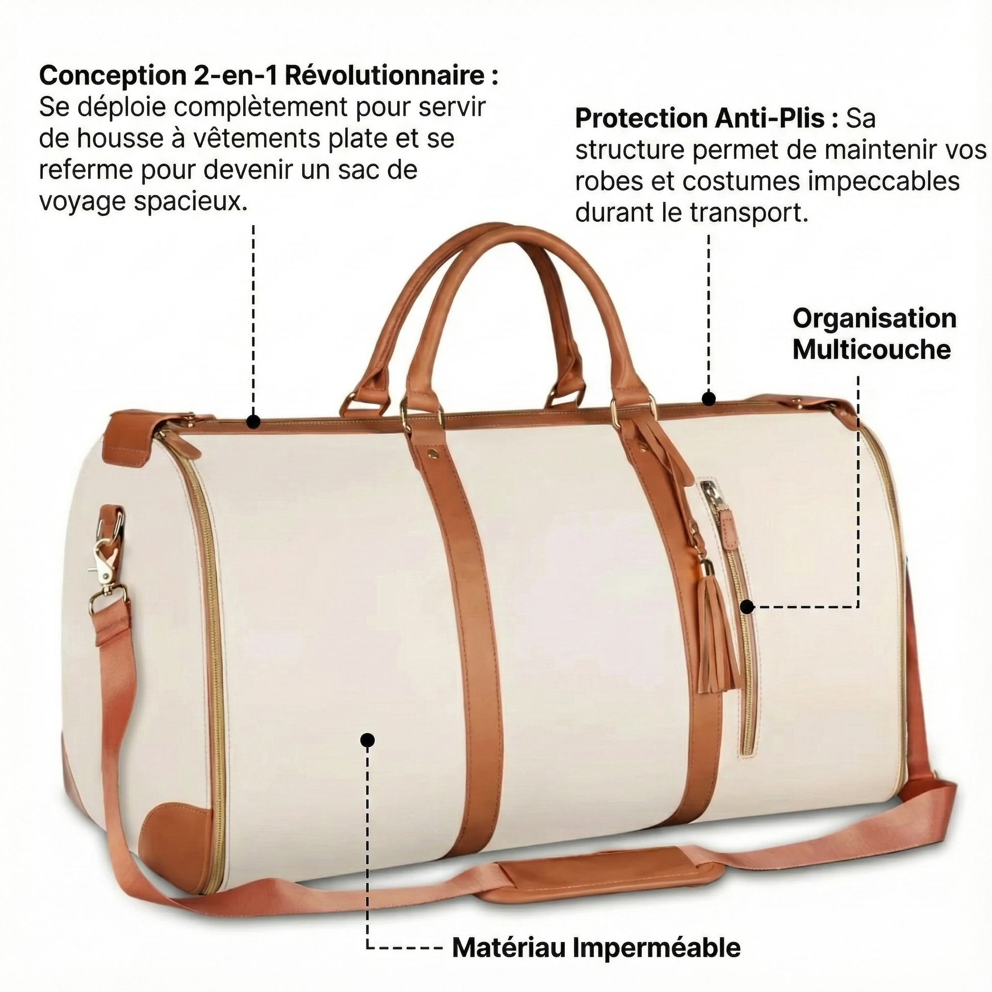 - Conception 2-en-1 Révolutionnaire : Se déploie complètement pour servir de housse à vêtements plate et se referme pour devenir un sac de voyage spacieux.