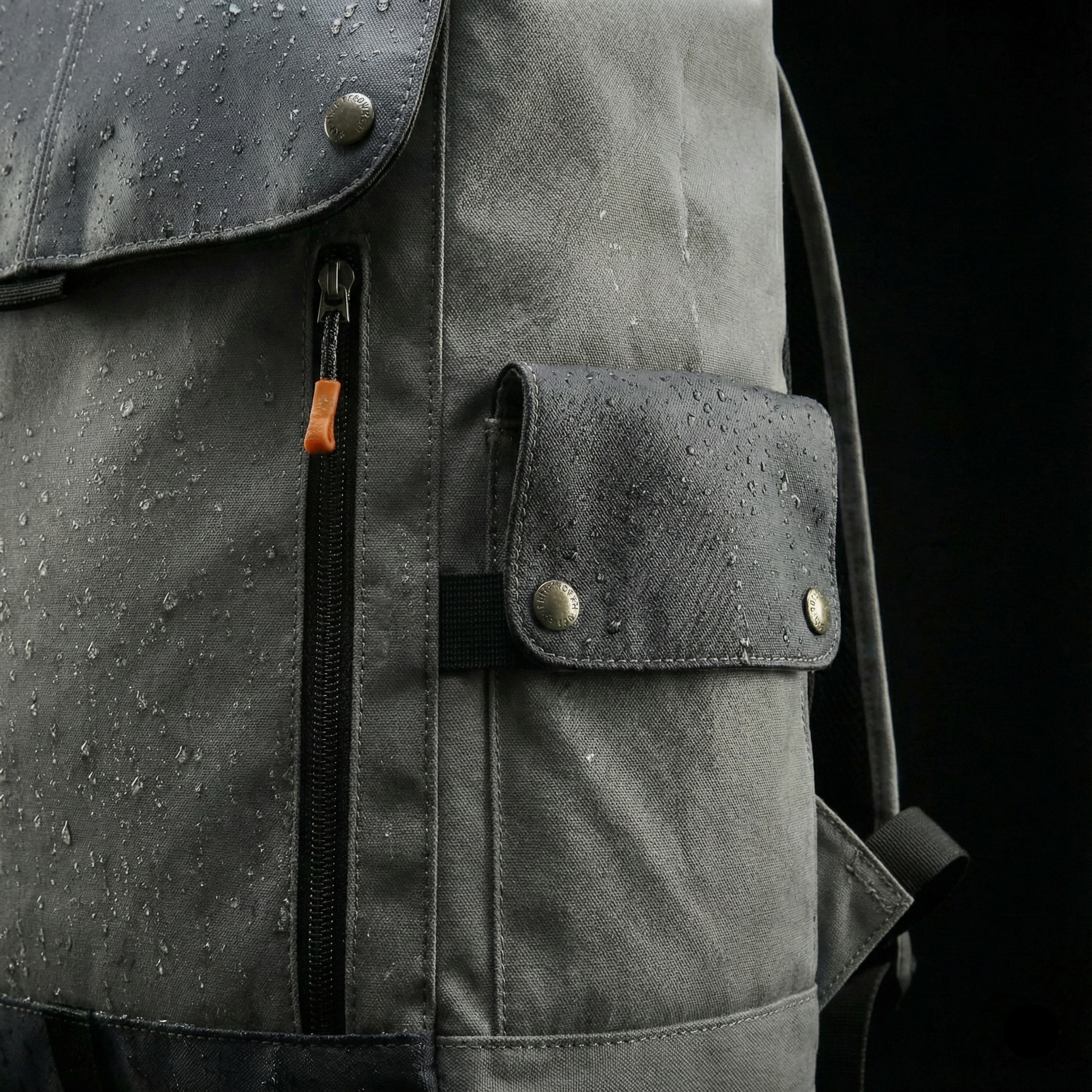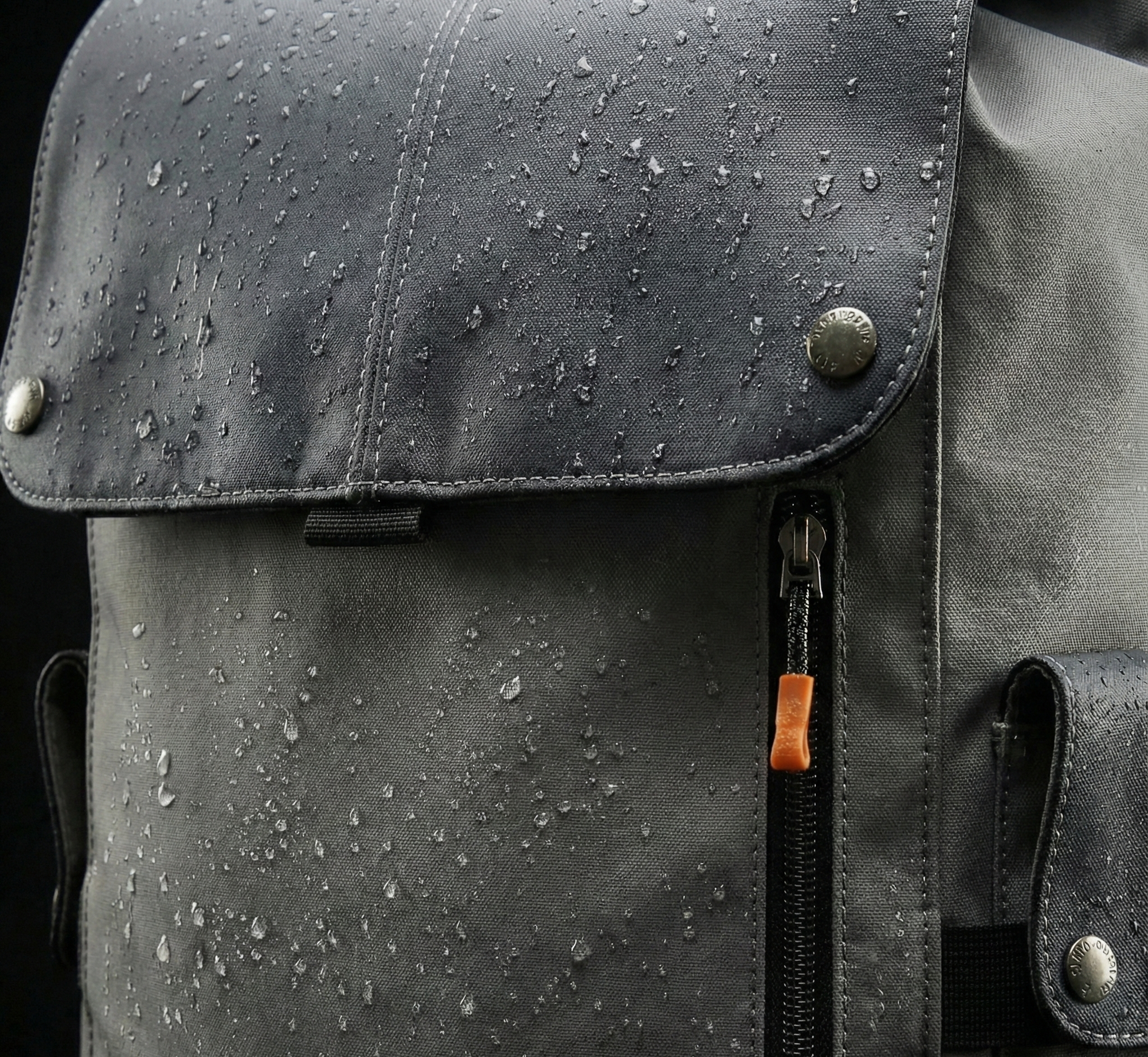 Tissu technique déperlant testé pour résister à une forte pluie. L’eau perle à la surface, sans jamais atteindre l’intérieur. C’est discret, mais redoutablement efficace.